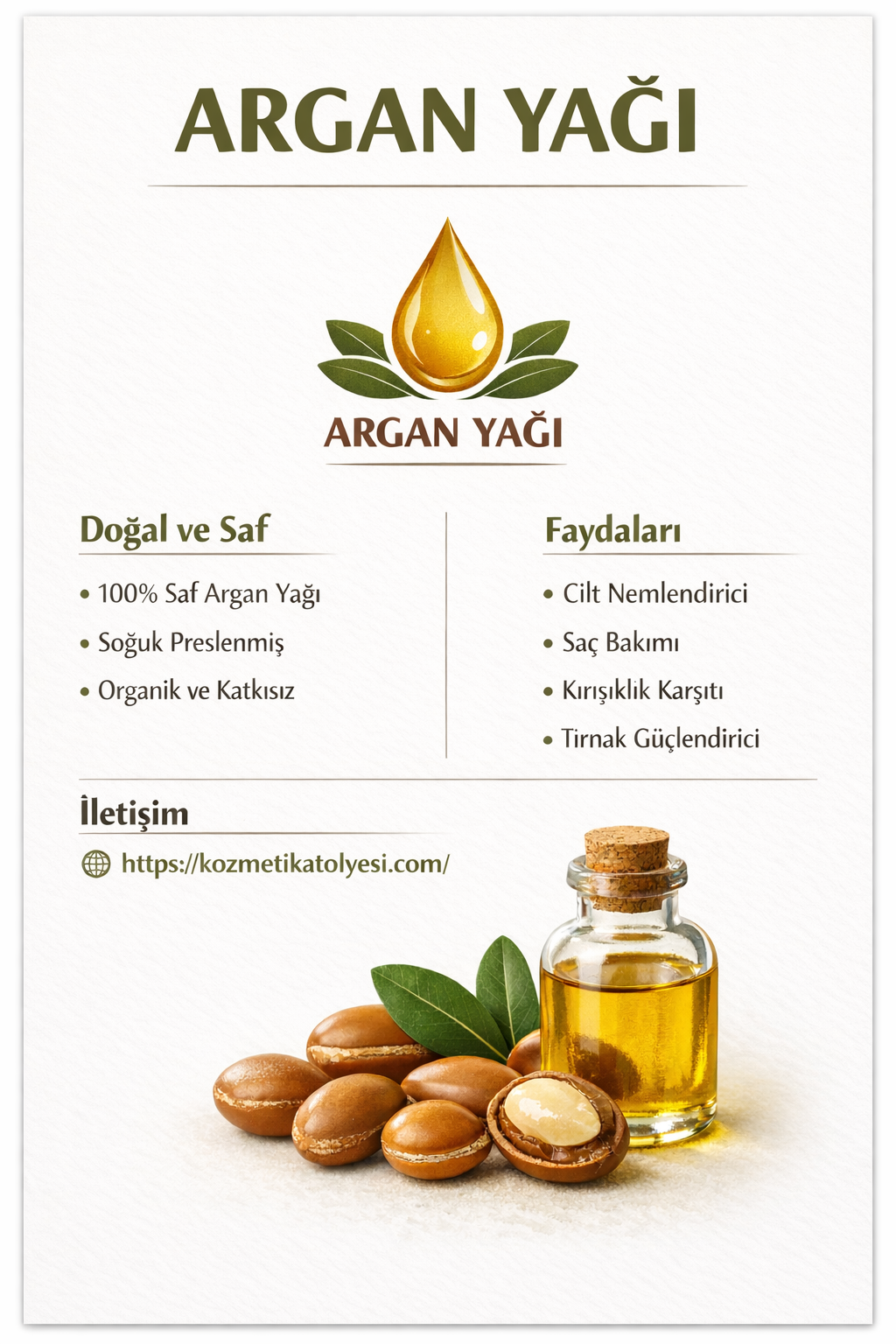 Argan yağı, doğal güzellik ve sağlık arayışında eşsiz bir kaynaktır. Zengin besin içeriği ve çok yönlü etkileri ile cilt ve saç bakımı için vazgeçilmez bir üründür. Doğanın sunduğu bu mucizevi yağ, günlük yaşamınıza dahil edebileceğiniz, hem pratik hem de etkili bir bakım çözümüdür. Sağlığınıza sağlık katacak bu ürünü mutlaka deneyin!